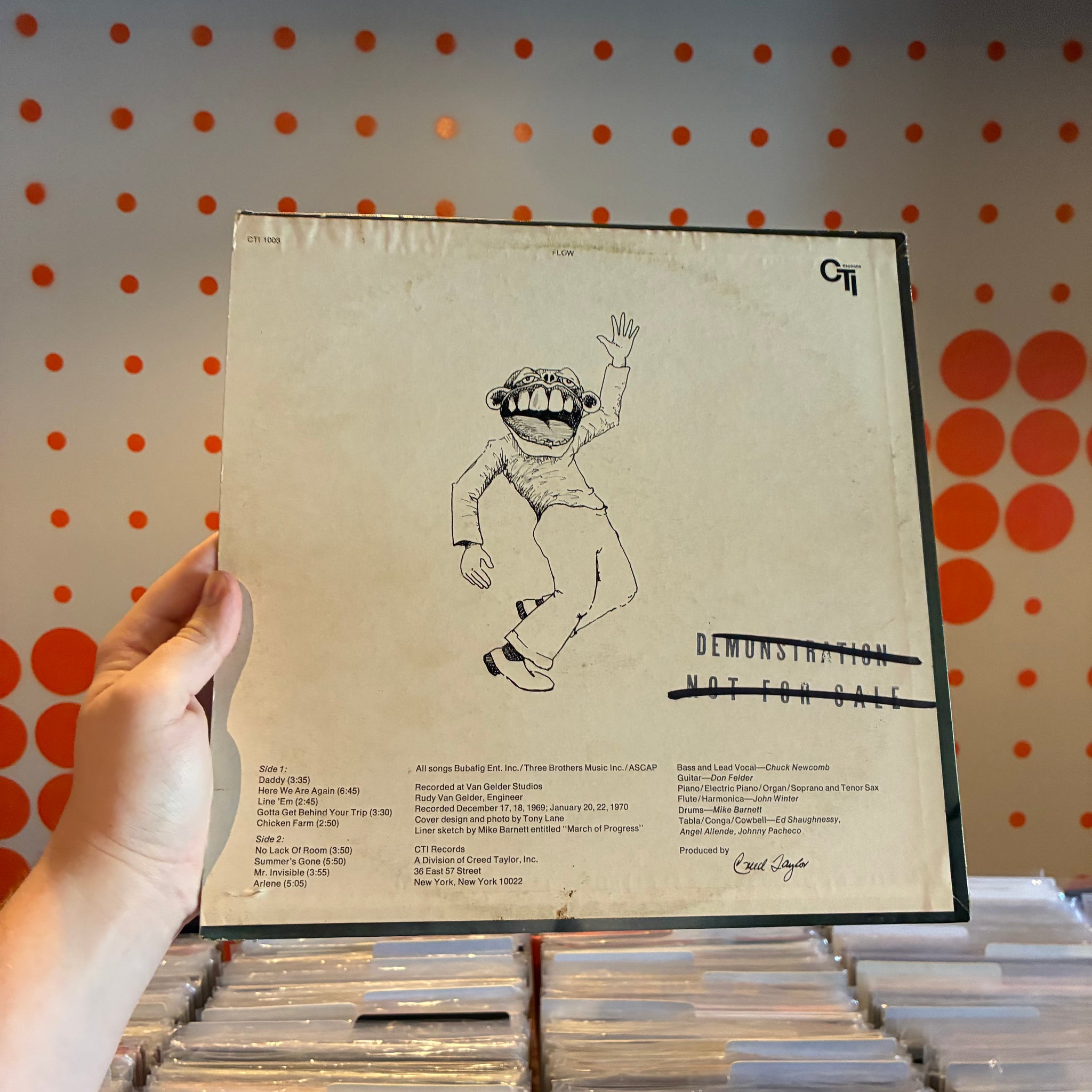 LIGHT CORNER ROUNDING. BOTTOM RIGHT CORNER OF THE FRONT COVER IS LIGHTLY FRAYED. FOUR SMALL PUNCTURE MARKS NEAR THE BOTTOM RIGHT CORNER. LIGHT SIGNS OF RING WEAR ON BOTH FRONT AND BACK COVERS. DEMO STAMP ON THE BACK COVER HAS BEEN CROSSED OUT. CLEAN LABELS. SOME VERY LIGHT, BARELY AUDIBLE MARKS ON BOTH SIDES OF THE VINYL. WE'VE STORED THE VINYL IN AN ARCHIVAL INNER SLEEVE SINCE CLEANING.