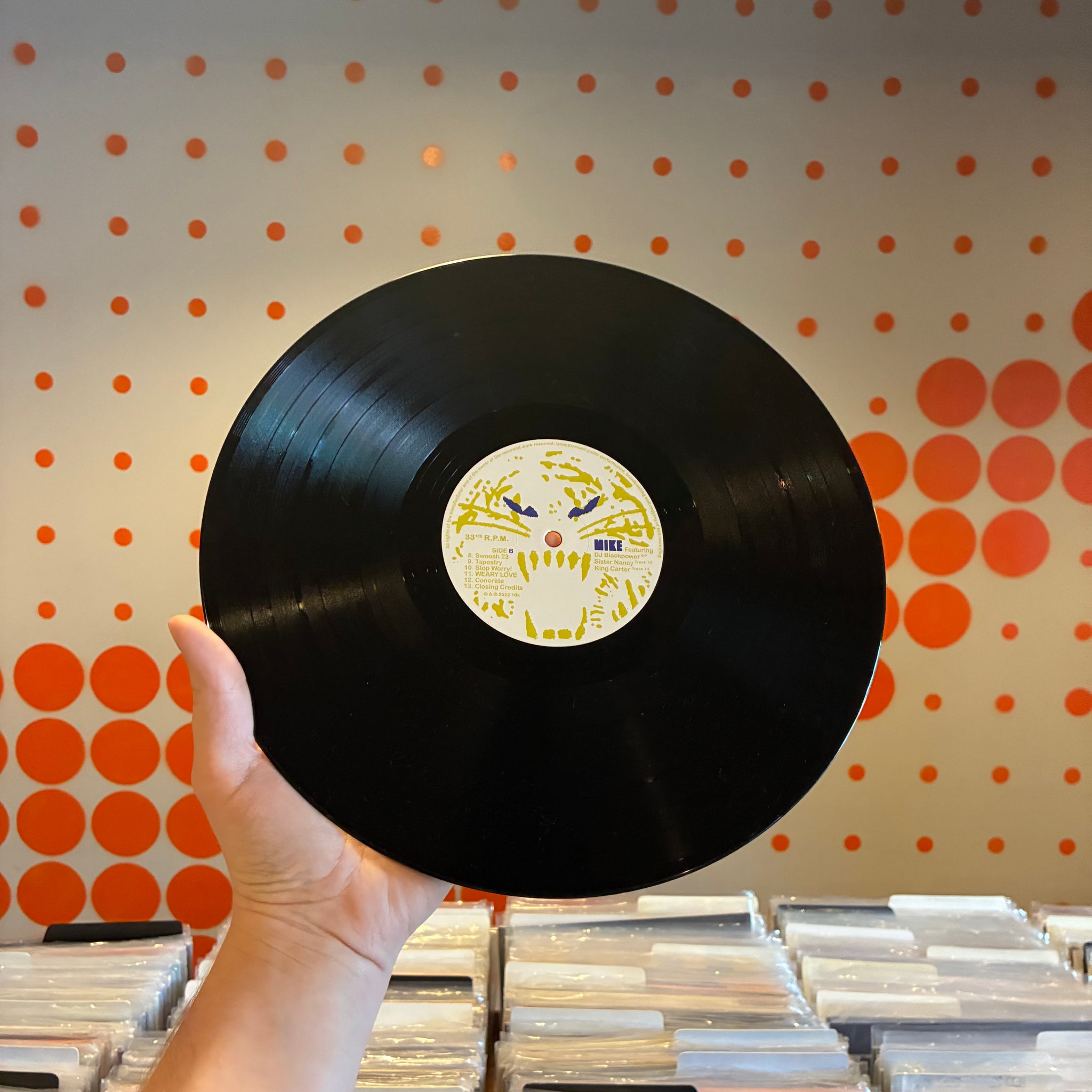 A MINOR DING AND SOME NOTICEABLE CREASING NEAR THE TOP LEFT CORNER OF THE OUTER JACKET. SMALL SPINDLE MARKS ON SIDE B LABEL. NO NOTICEABLE MARKS OR SCRATCHES ON THE VINYL.