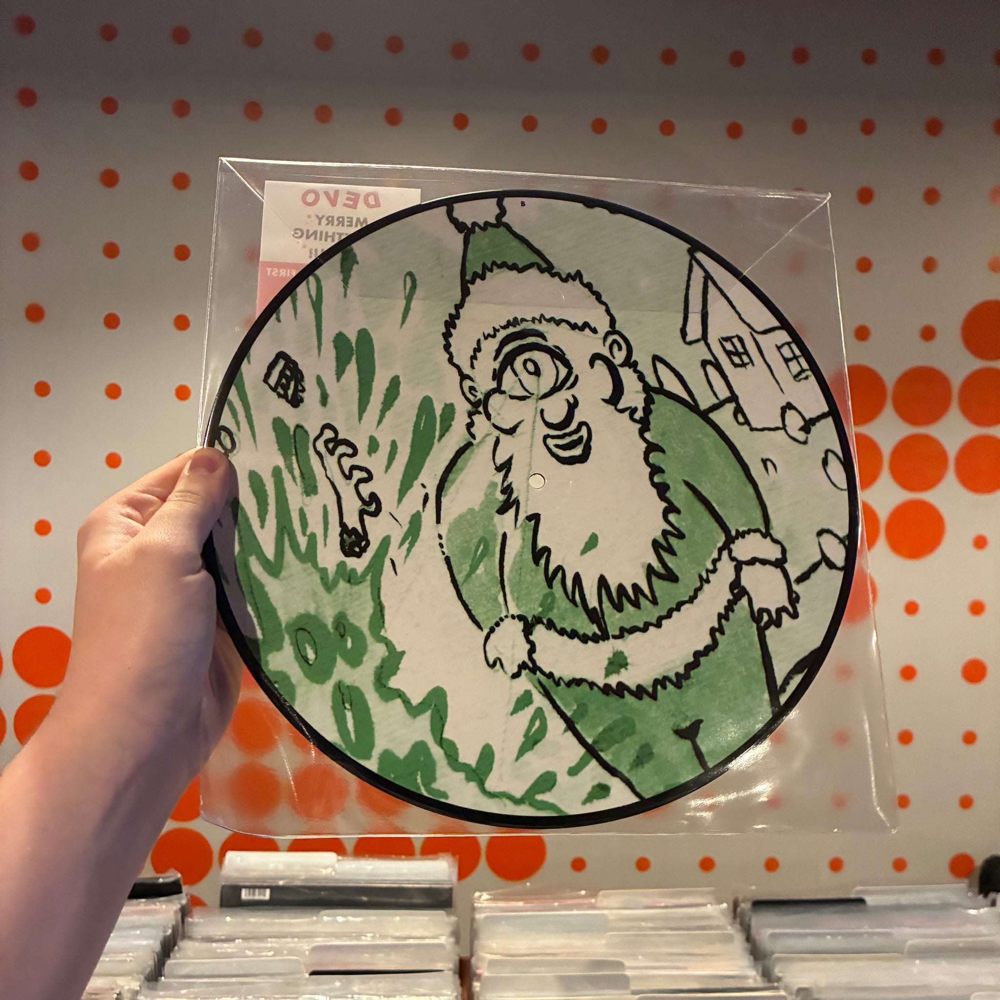 "Merry Something to You is a picture disc of Devo's only holiday song with artwork of the Santa Cyclops drawn by Mark Mothersbaugh from the original 2009 Merry Something to You music video."
