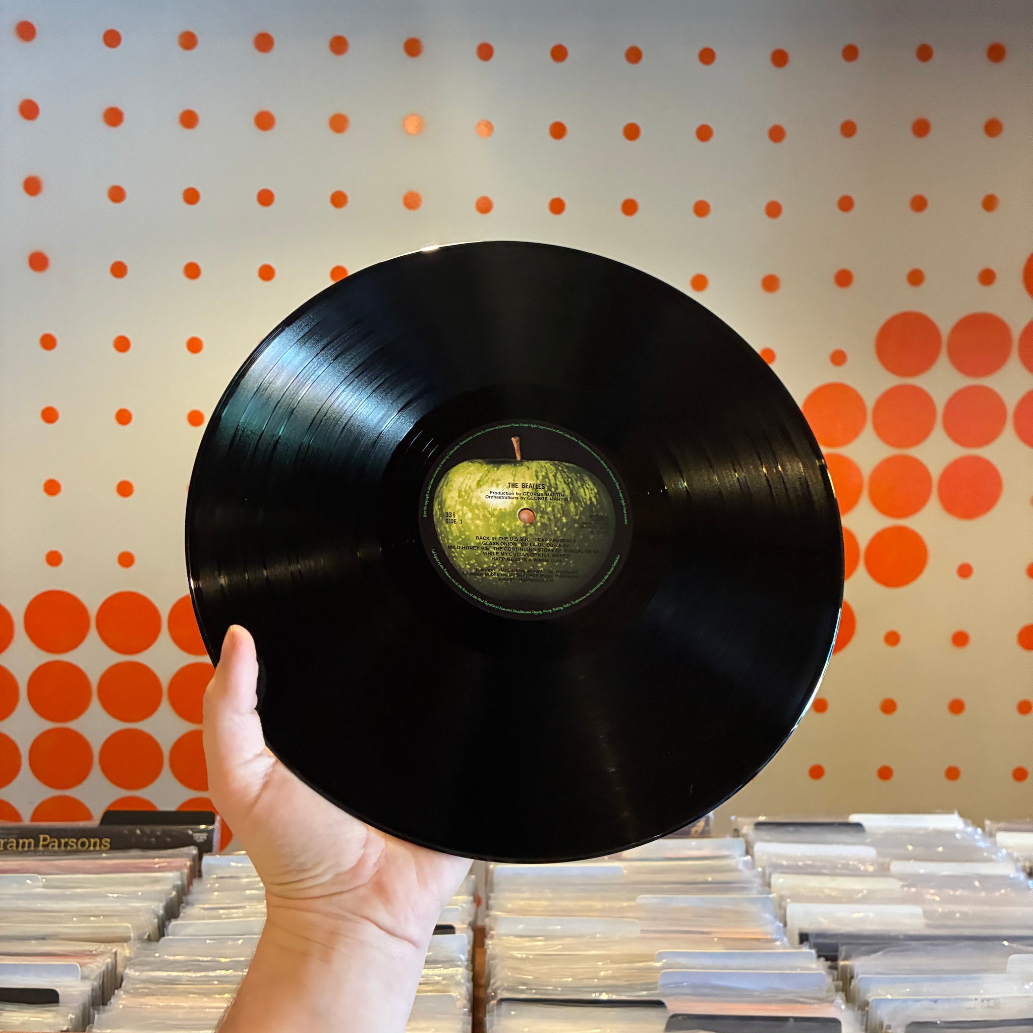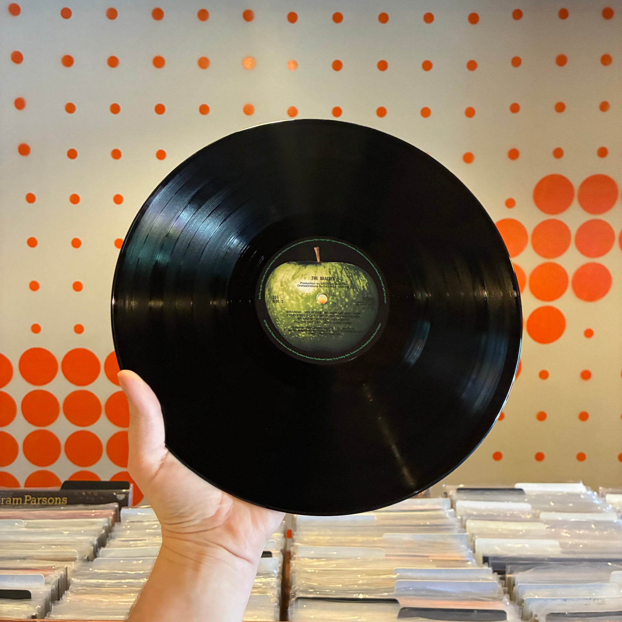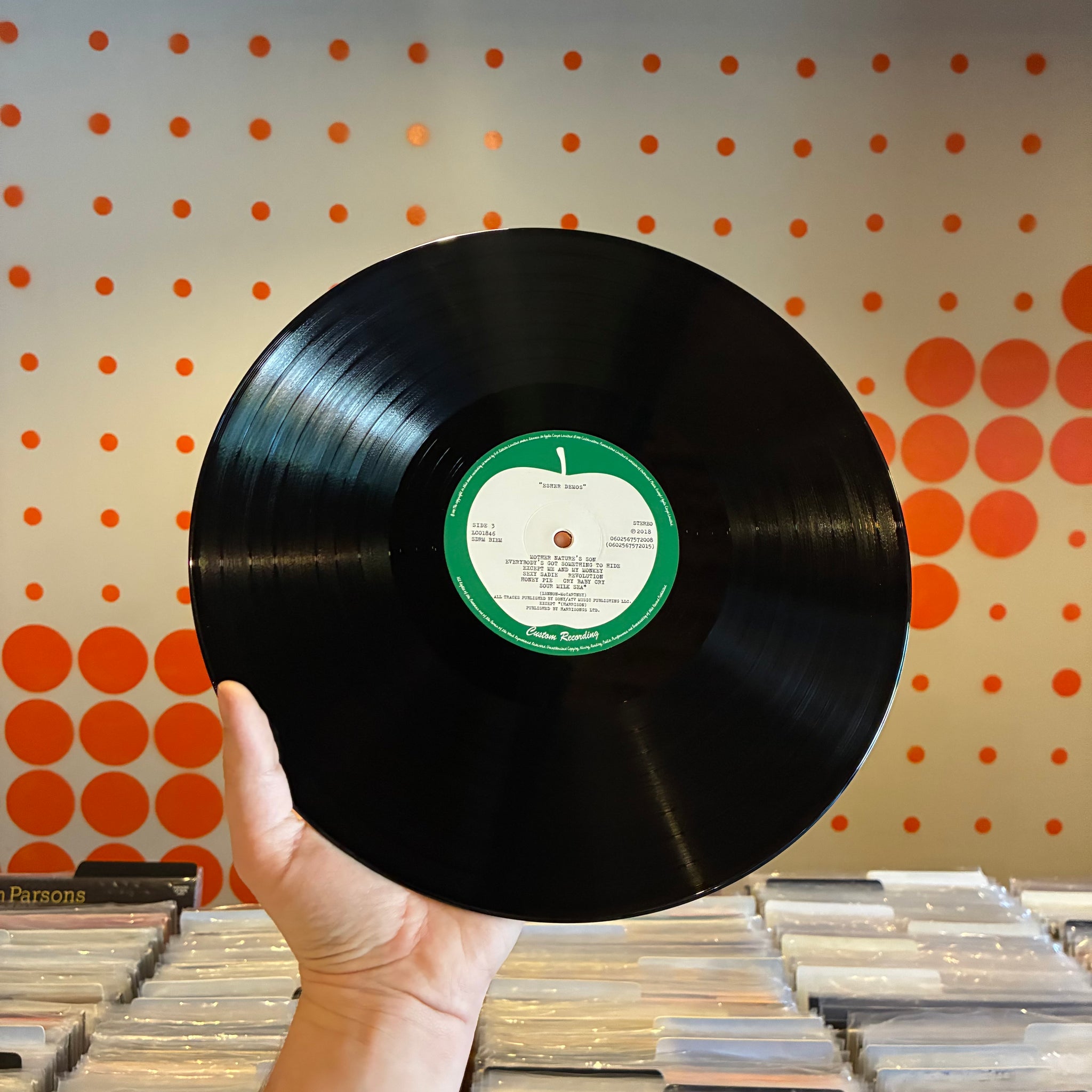 SHARP CORNERS. NO NOTICEABLE SIGNS OF WEAR ON THE OUTER BOX. SMALL SPINDLE MARKS ON WHITE ALBUM DISC, SIDES 1, 2 & 3 LABELS. STRAY MARKS ON SIDE 1 OF THE WHITE ALBUM AND SIDE 2 OF THE ESHER DEMOS ARE INAUDIBLE. WE'VE STORED THE VINYL IN ARCHIVAL INNER SLEEVES SINCE CLEANING.